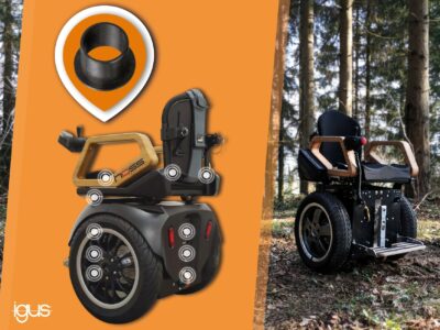 Azért, hogy a kerekesszékesek könnyebben térhessenek le a járt útról, a HOSS Mobility GmbH olyan önszintező elektromos kerekesszéket fejlesztett ki, amelynek elöl nincsenek kerekei. Kitámasztók gondoskodnak arról, hogy az eszköz még akkor se borulhasson fel, ha valamilyen okból nem kap áramot. A kitámasztók vészhelyzetben gyorsan kitolódnak, ami komolyan megterheli a csapágyakat. Éppen ezért szavaztak bizalmat a fejlesztők az igus iglidur tribo-polimerekből készült csapágyainak. Kompakt méretüknek, valamint por- és ütésállóságuknak köszönhetően ezek a csapágyak ideálisan használhatók a kitámasztó szerkezetben.